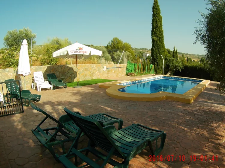 El exterior es uno de los grandes atractivos de La Casita. Dispone de piscina con clorador salino, porche, zonas verdes, mobiliario exterior y barbacoa, todo ello rodeado de un entorno natural de olivares.